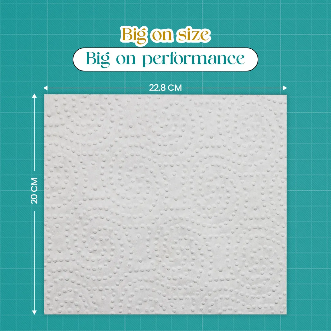 The Kressa Kitchen tissues are made with 100% Virgin Pulp with 2 layers, so the tissue has superior wet strength and can be used in cleaning multiple things. Each kitchen tissue roll has 60 sheets of 2 layers making it more durable and long-lasting.