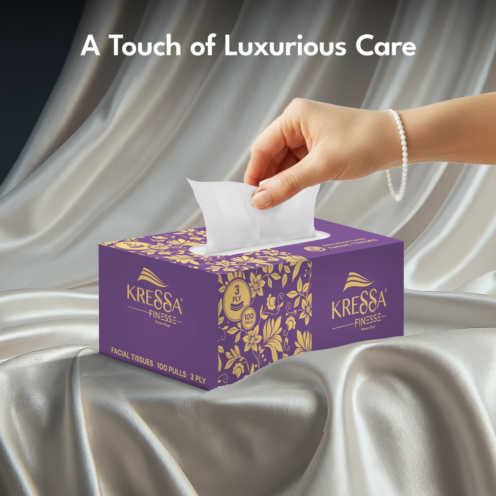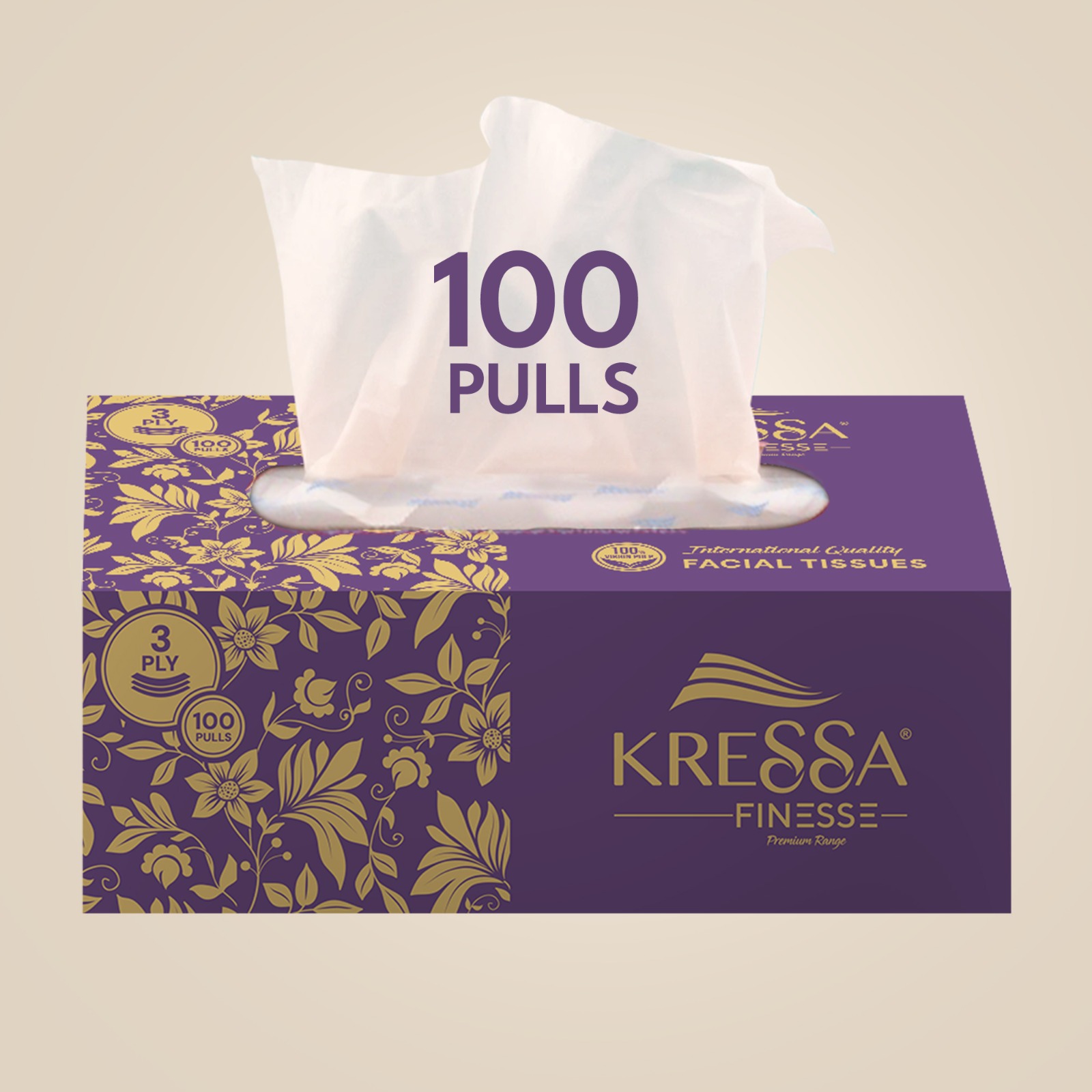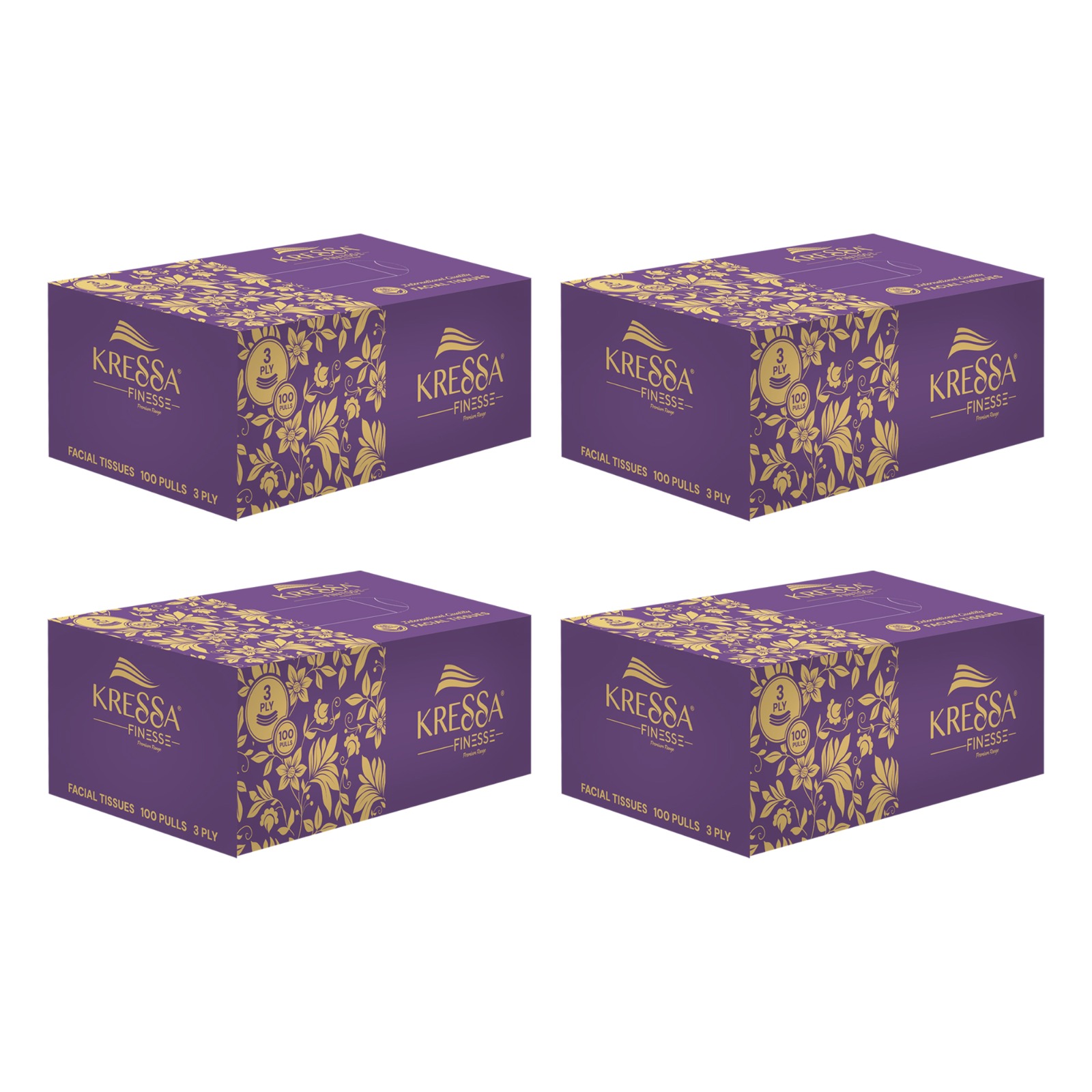 • Kressa Finesse Ultra-Premium 3-Ply facial tissues are made from 100 % virgin pulp, making them ultra-soft and highly absorbent.