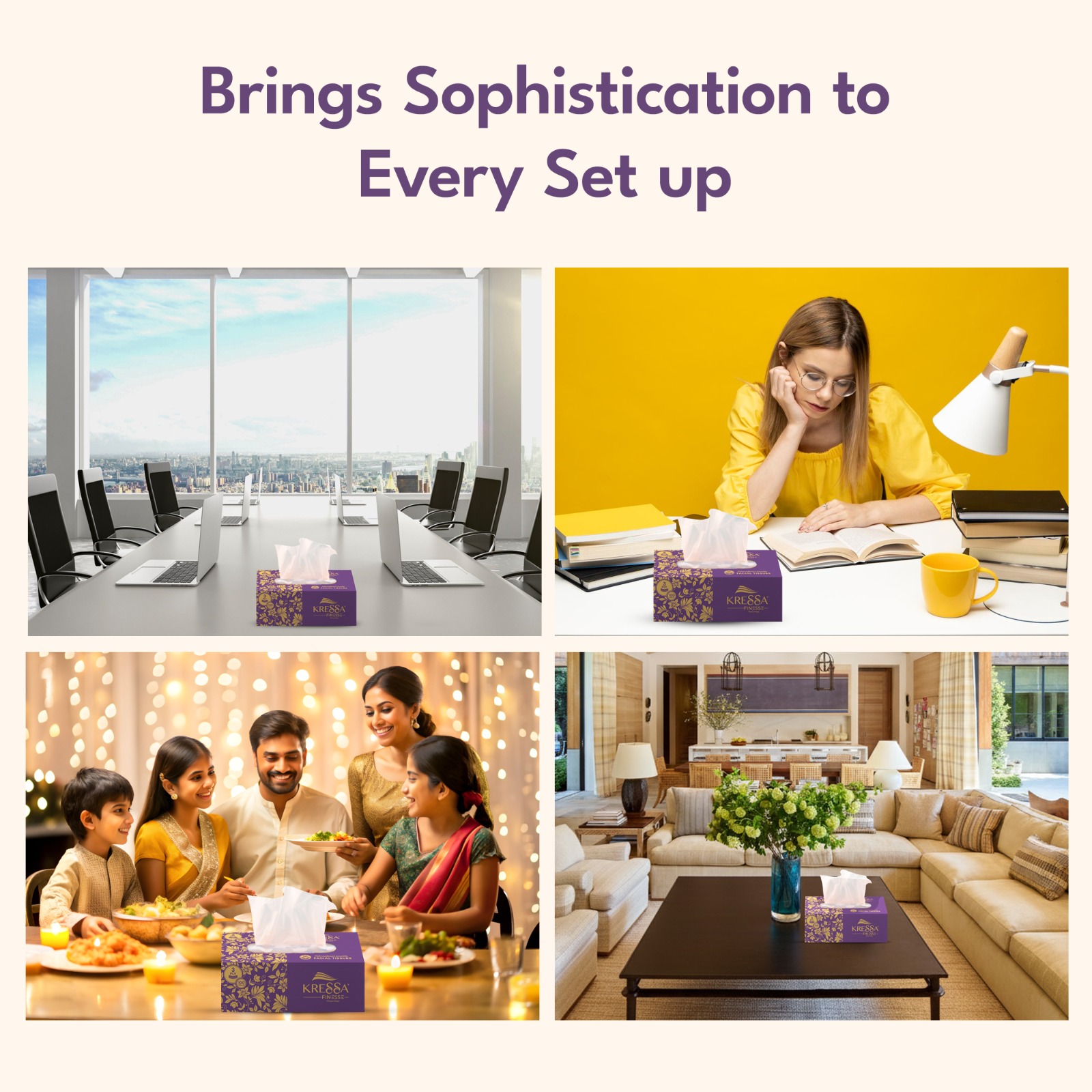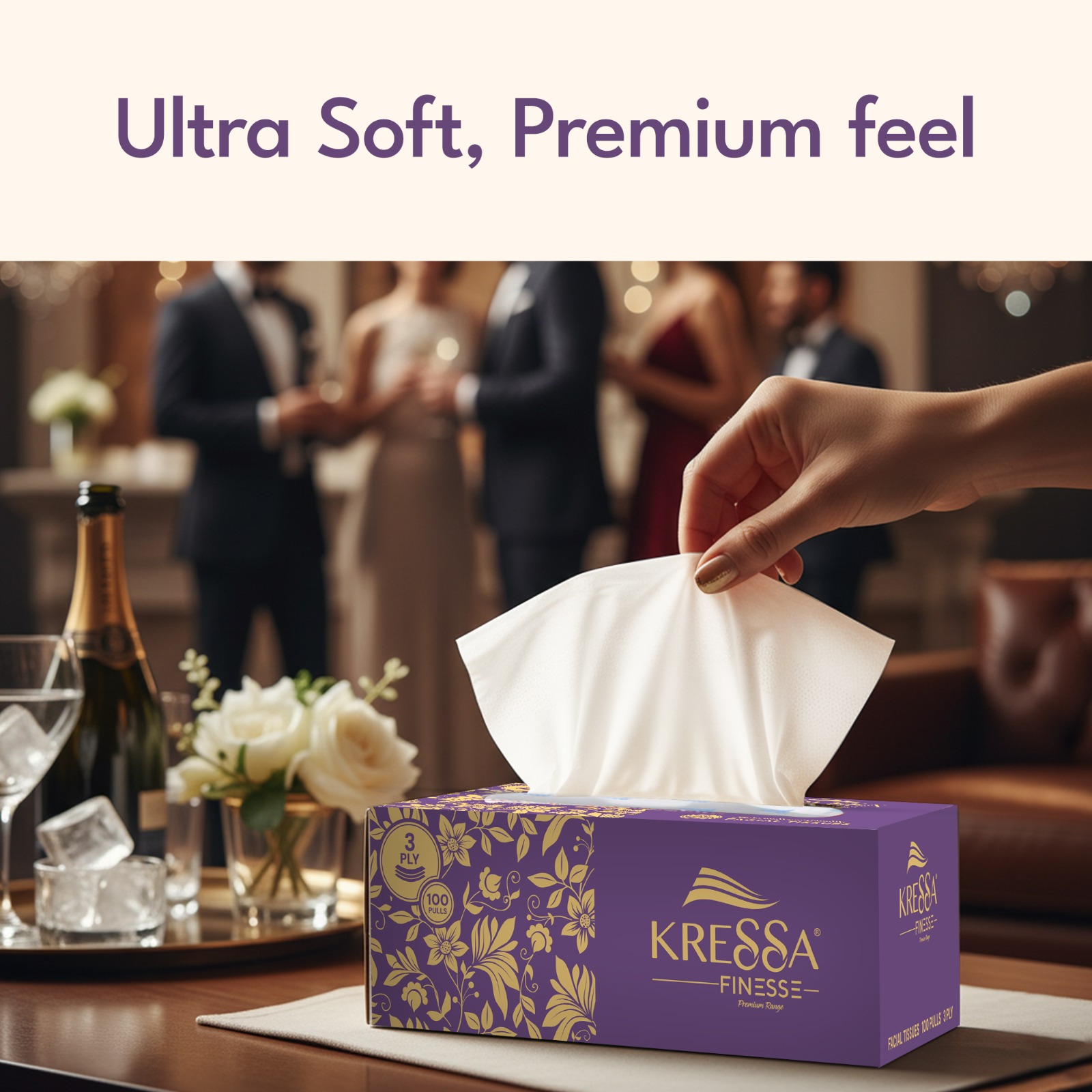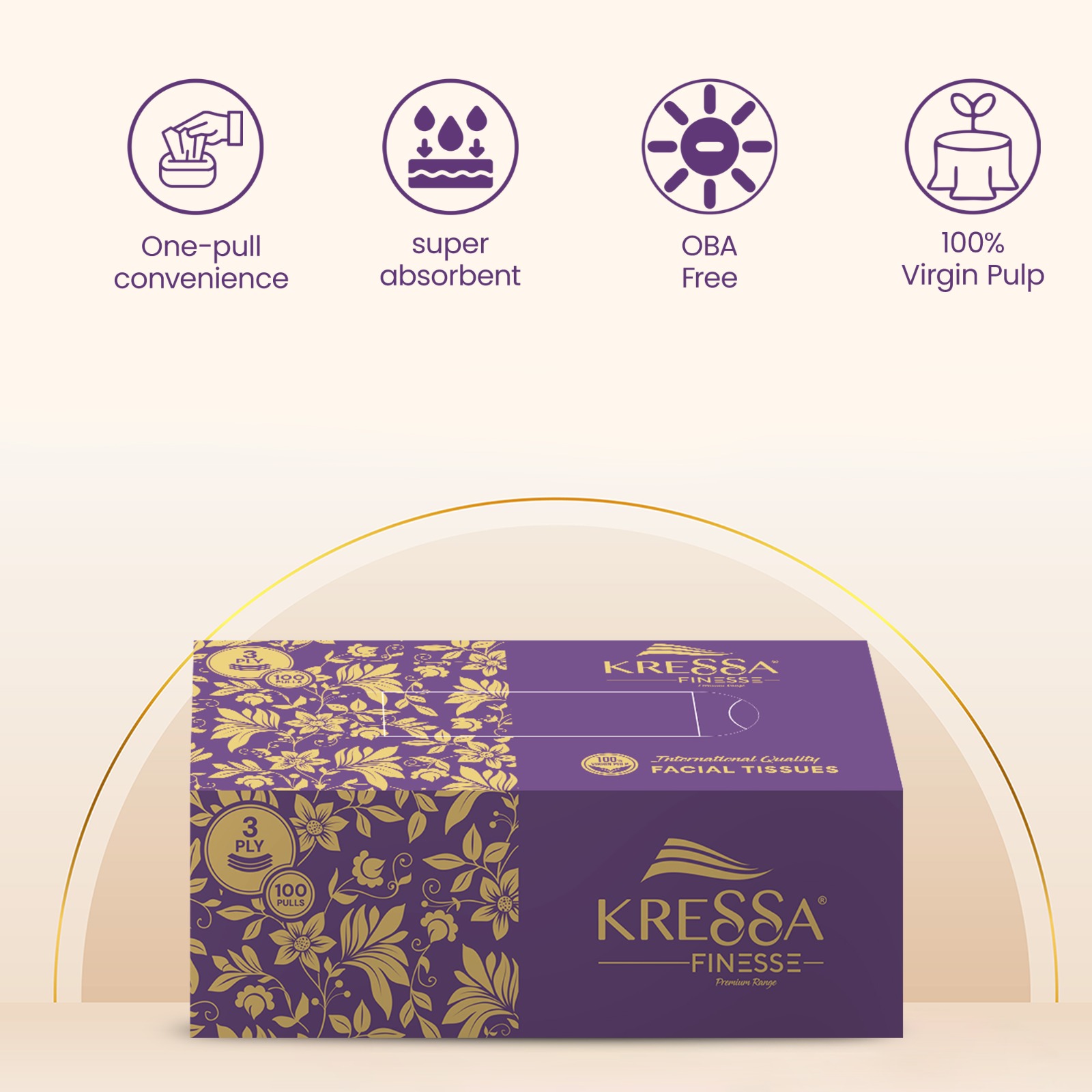 • Kressa Finesse Ultra-Premium 3-Ply facial tissues are made from 100 % virgin pulp, making them ultra-soft and highly absorbent.